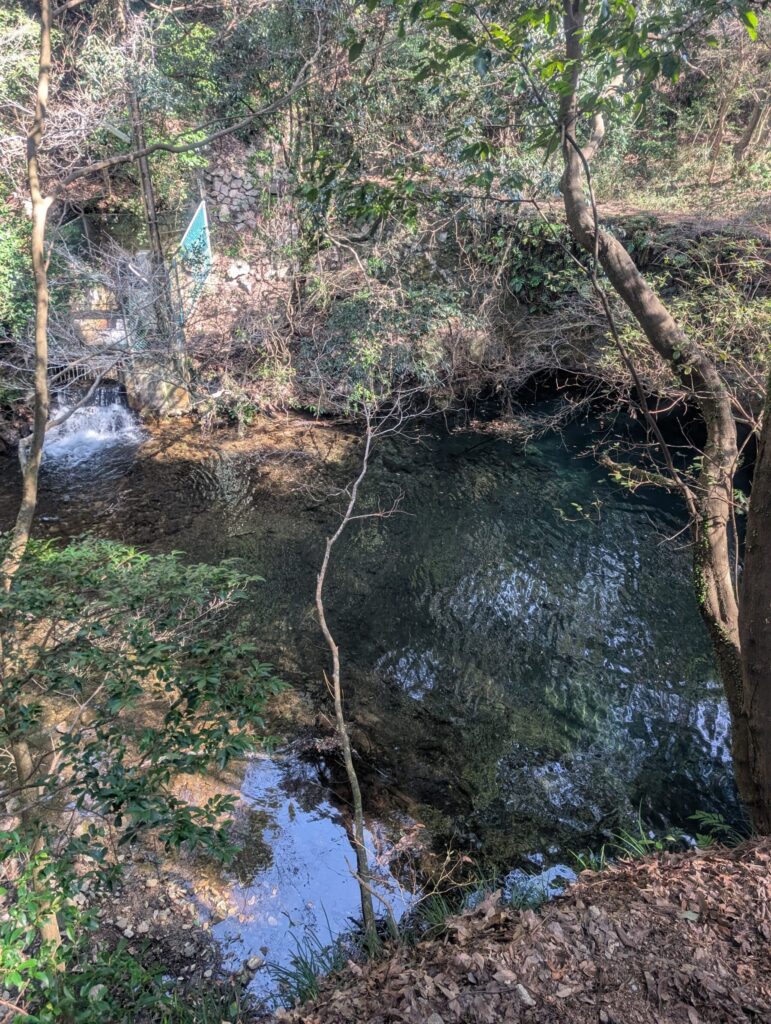 水量の少ないこの時期でも、驚くほどの透明度で青い水面。