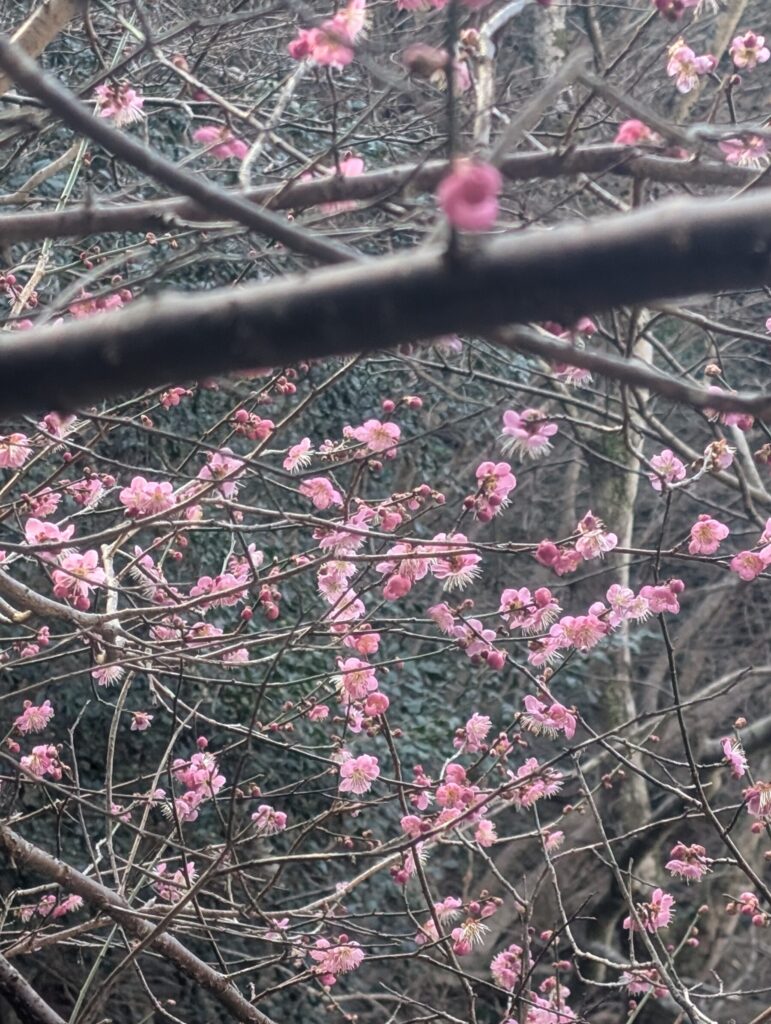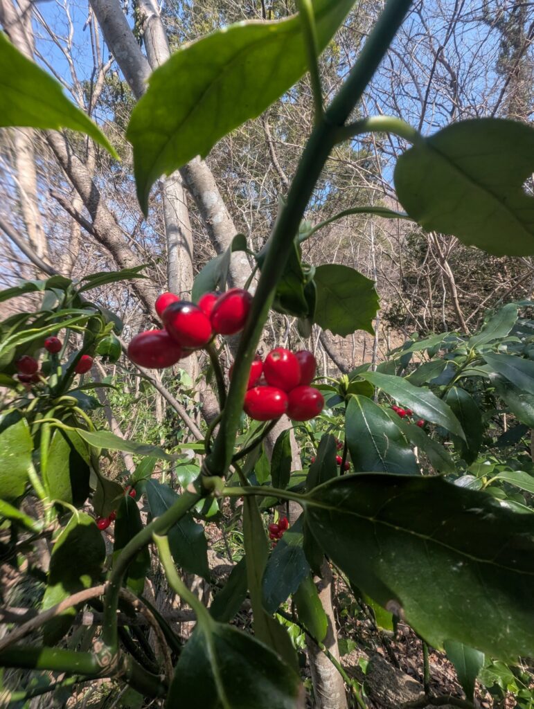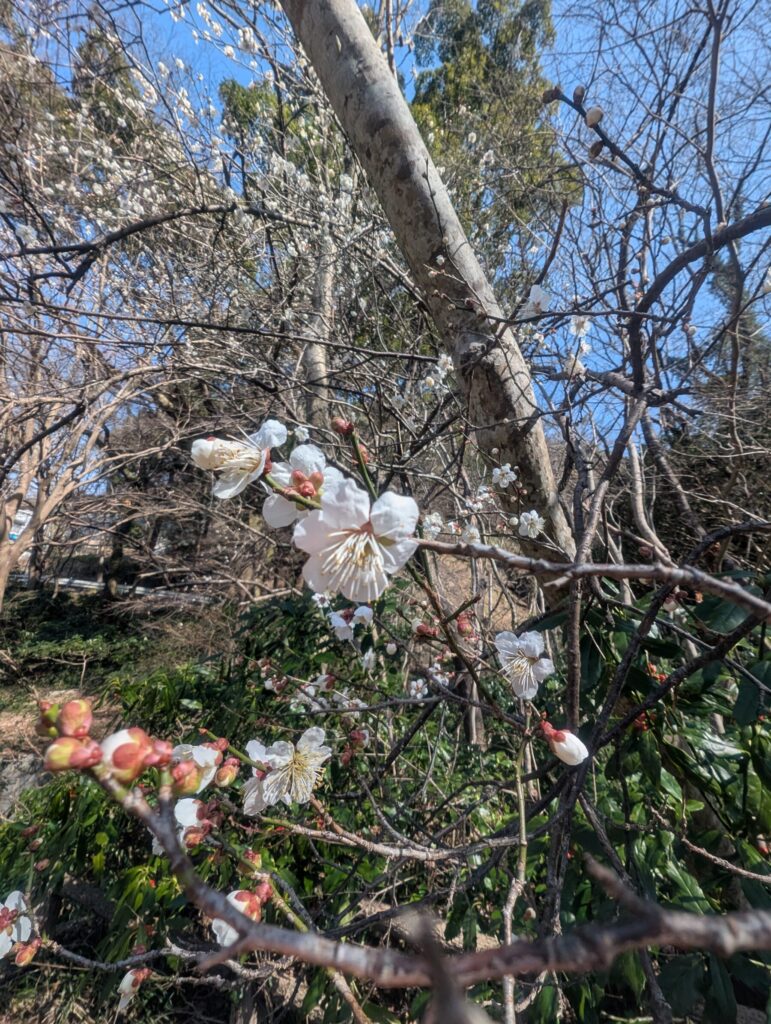 梅や赤い木の実、早咲きの桜が目を楽しませてくれます。